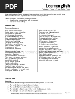 Pronunciation poem british council. Be the first one to write a review. In signature pronounce the g. Getting students to read out chunks of a poem as they copy the way you say it can be excellent practice for their pronunciation.